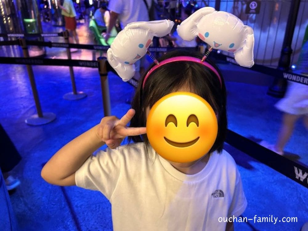 館内にはサンリオグッズがたくさん並んでいて、子どもたちはカチューシャ型のおもちゃを購入。